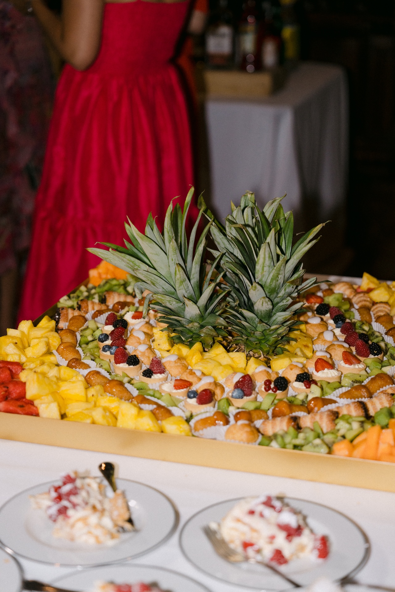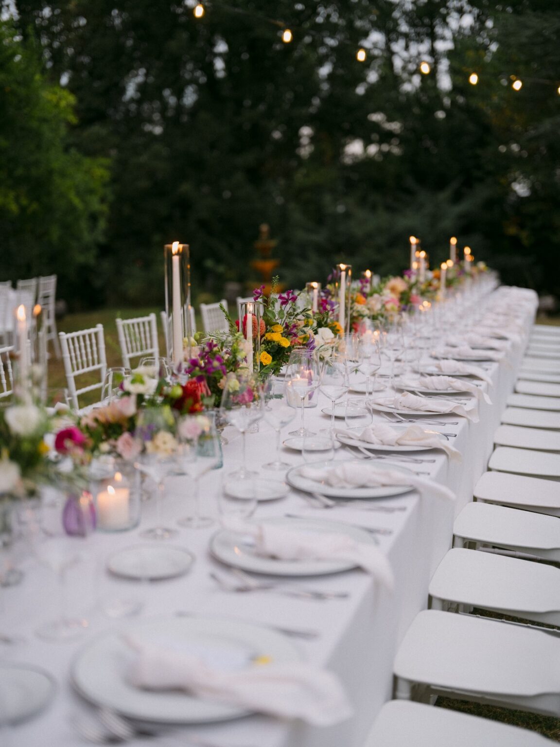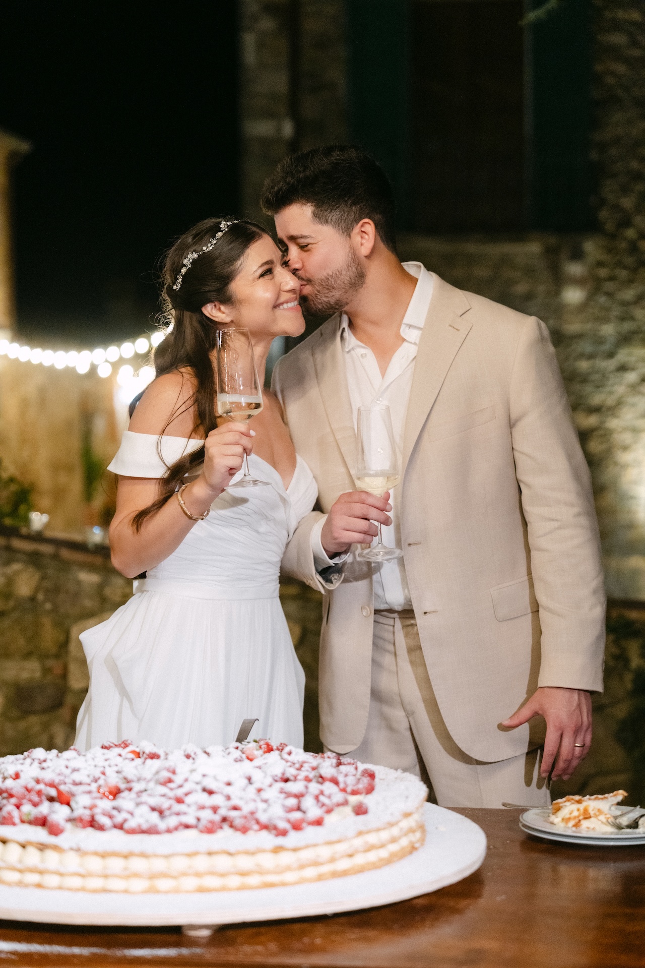 After the “I do,” the borgo was bathed in the warm sunset light for a sprawling aperitivo, followed by an elegant dinner. One of the most admired moments was the wedding cake, finished “live” by the couple in front of all the guests.