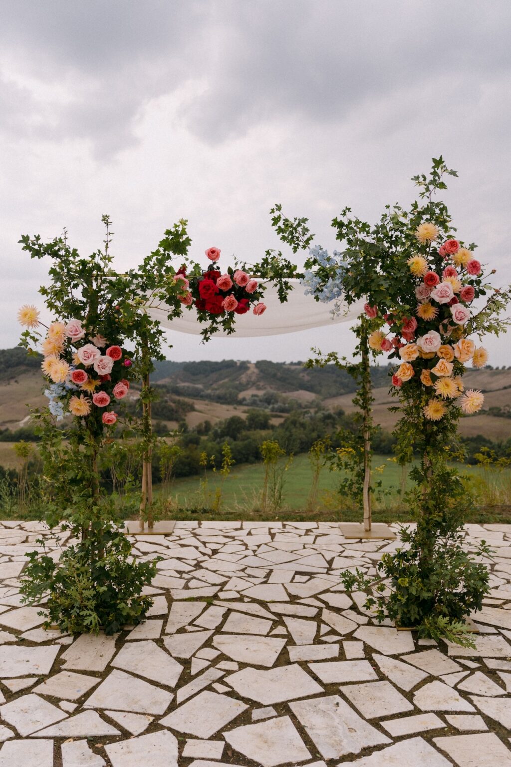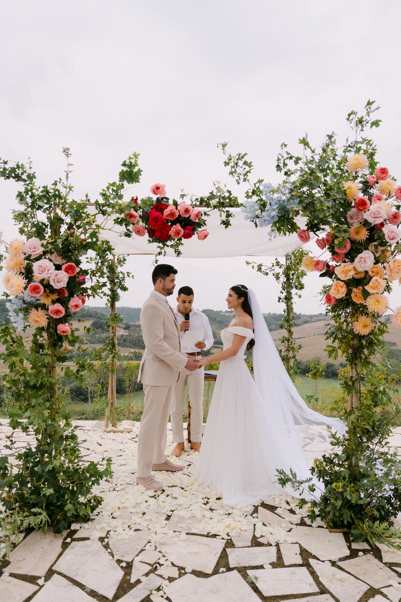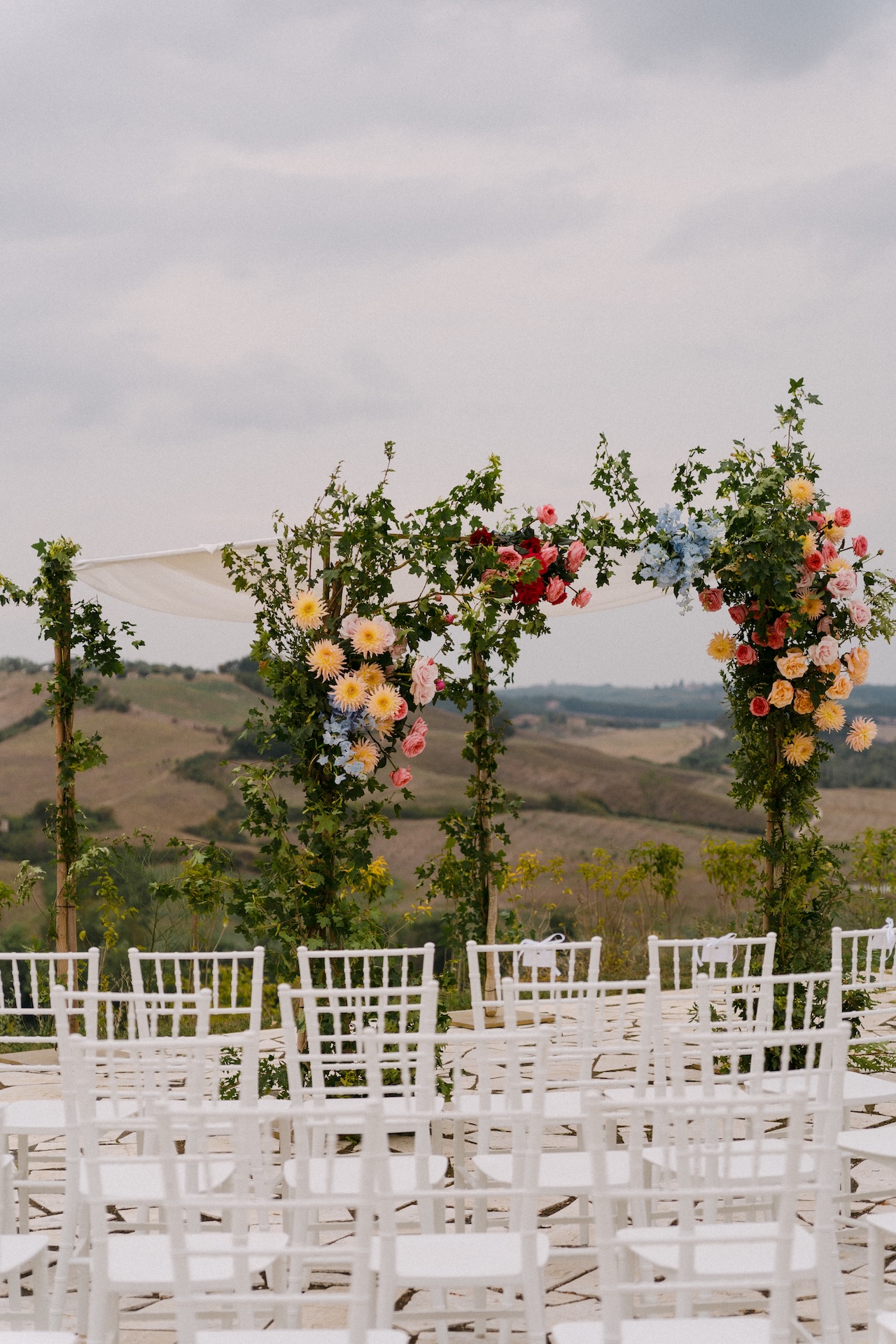 For the most moving moment of the weekend, the Jewish ceremony, we transformed the panoramic terrace of Borgo Laticastelli into a sacred space, centered around a majestic Chuppah adorned with a cascade of flowers in warm, natural tones. Under the August sun, Mikael and Richard’s vows merged with the raw beauty of the Tuscan hills in an embrace of faith and nature.