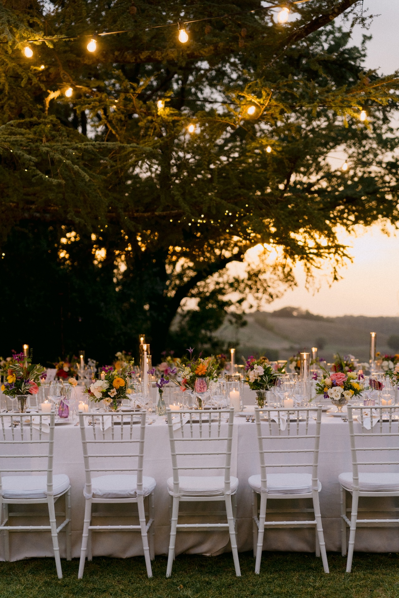 To make it truly magical, we curated a live soundtrack with a trio of accordion, guitar, and vocals, filling the air with folk melodies and a timeless sense of joy. As wedding planners in Tuscany, our goal was to create a climate of spontaneous celebration, concluding with a perfectly crafted tiramisù: an evening where conviviality was the true star of this Italian destination wedding.