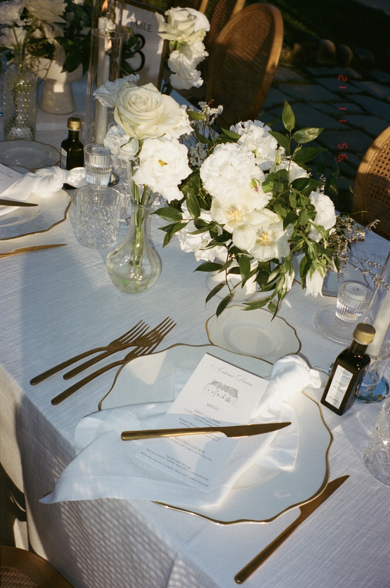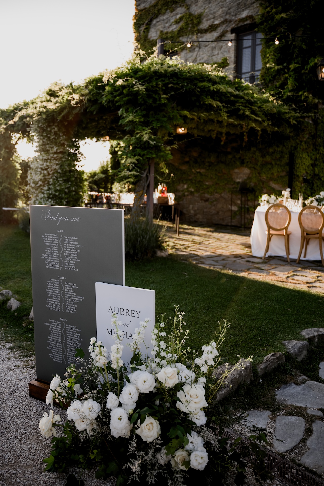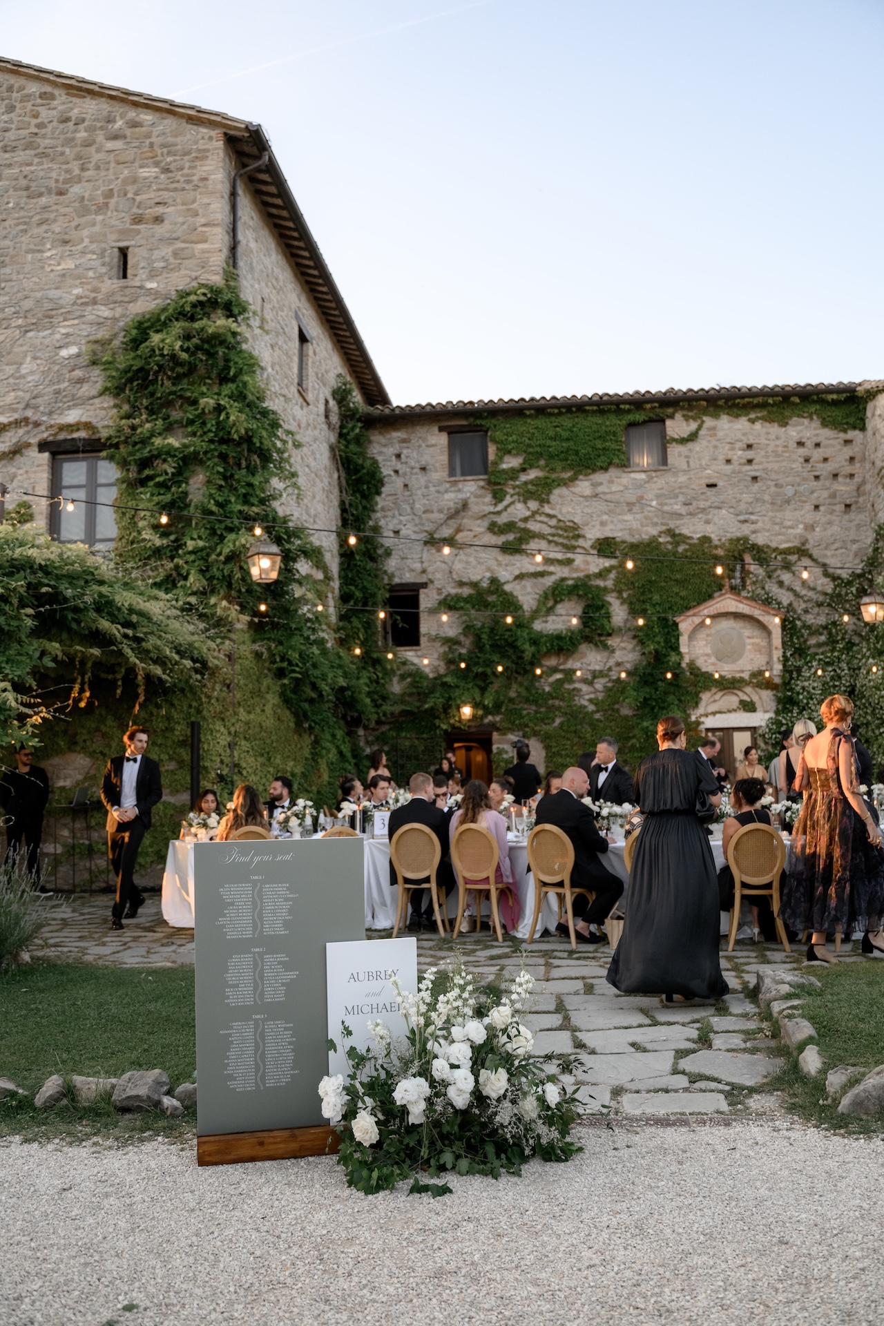 The aesthetic of the big day was a dialogue between nature and sophistication. The floral styling featured cascades of white flowers standing out against the green ivy of the Castle, while the table setting, with slender candles and classic porcelain, reflected a timeless elegance.