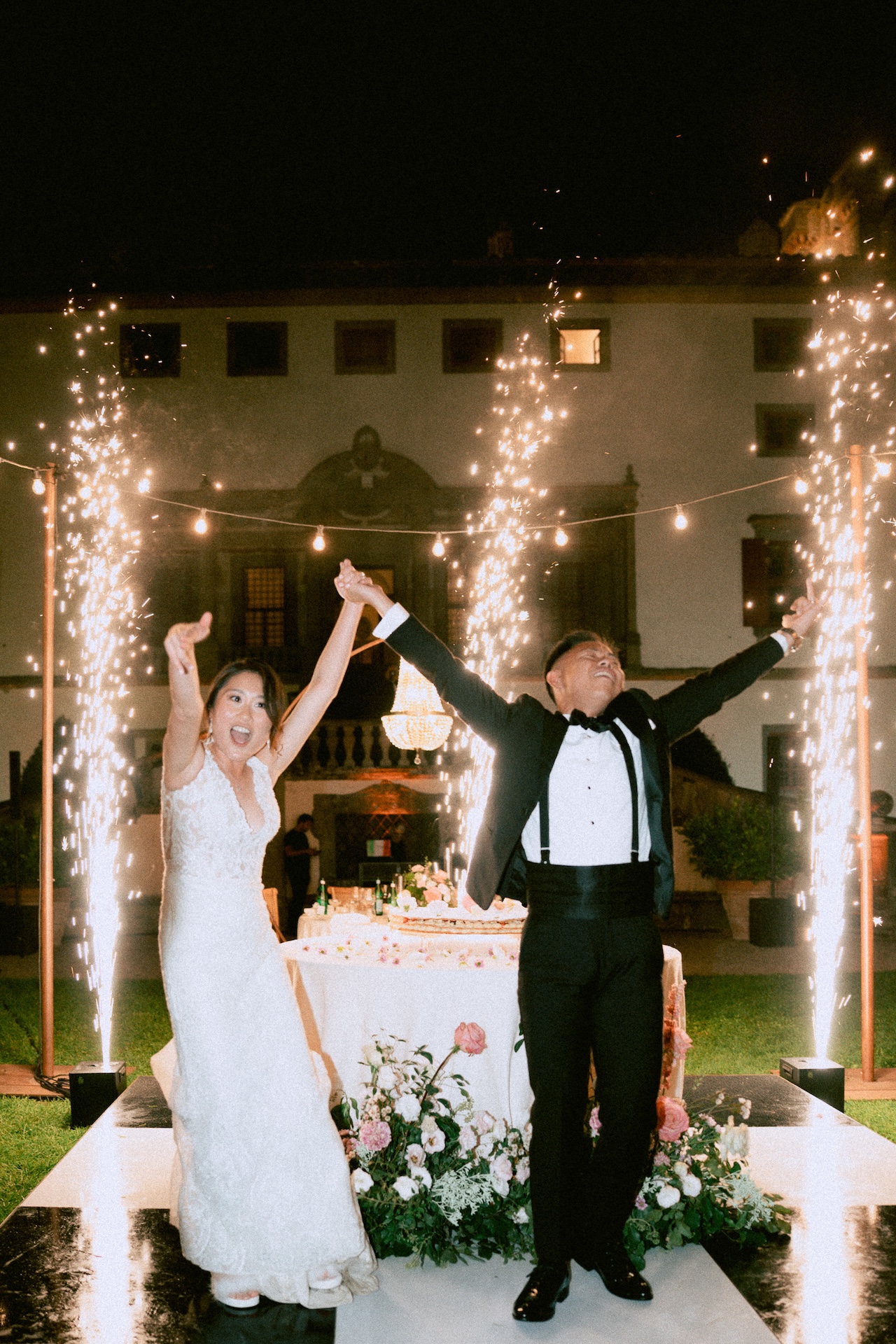 To further enhance this moment, the cutting of the cake is often accompanied by a symphony of fireworks or sparklers lighting up the night sky.